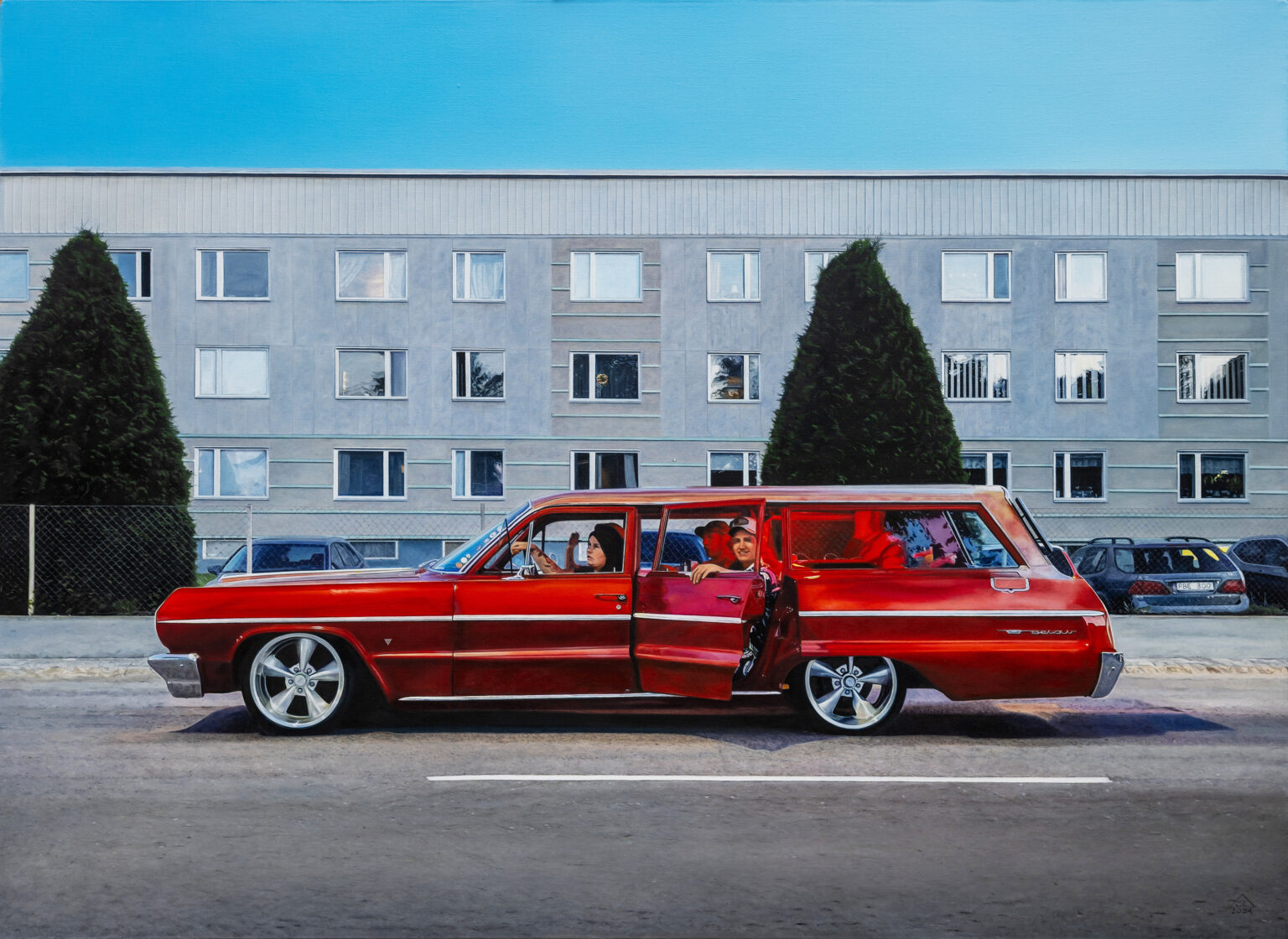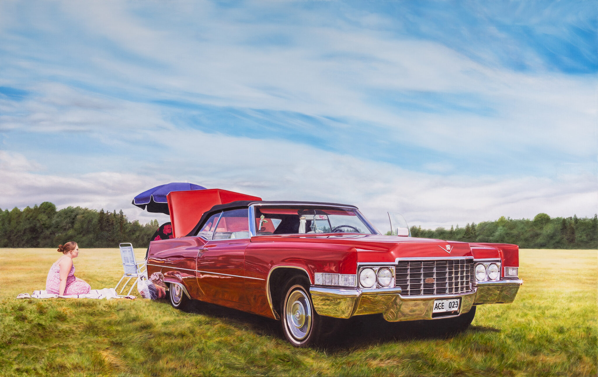 På Runö Möten & Events visar Anna C Eriksson en kollektion med hyperrealistiska oljemålningar som med fotografisk detaljrikedom fångar ögonblick där bilen står i centrum – Road Trip.