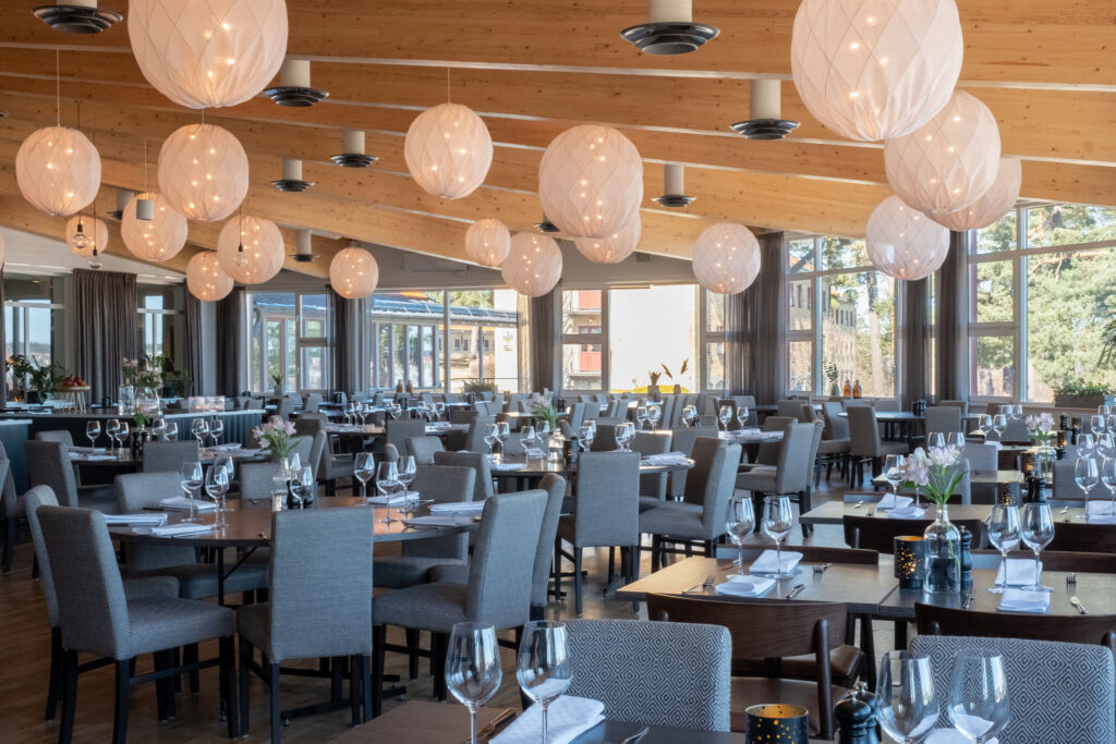 Vi klär om stolsdynor och när rumsavskiljarna i konferensrummet börjar se tråkiga nu – då åker penseln fram! Dessutom tar vi hand om textilierna så att de håller länge, höj gärna blicken i restaurangen och njut av de vackra Pia-lamporna.