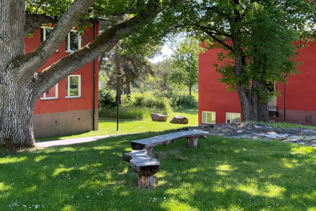 När ett par ekar föll till marken skapades nya bänkar med hjälp av grannens sågverk. Det vackra stockarna finns nu utplacerade för sköna stunder och samtal med utsikt.