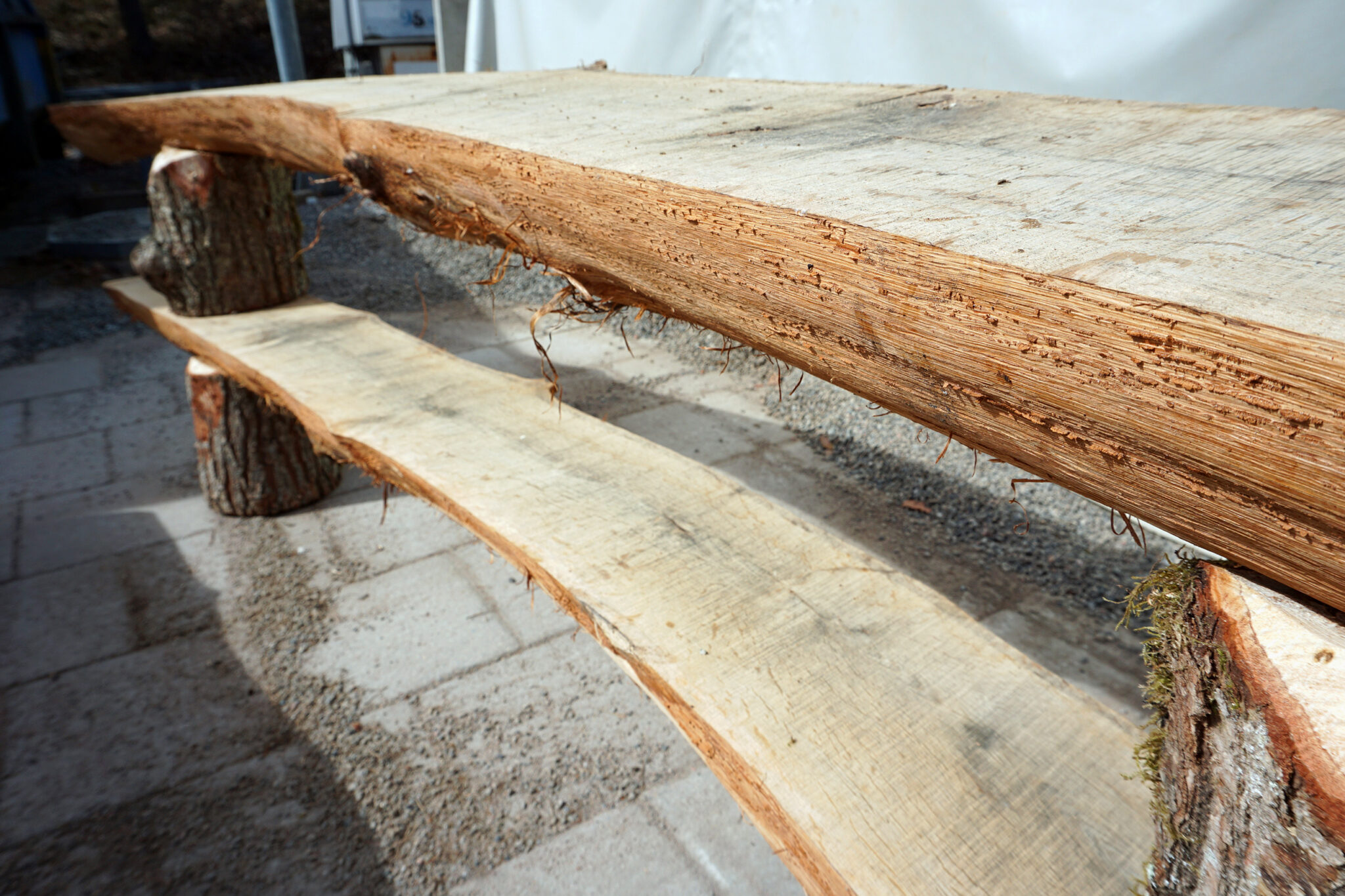 När ett par ekar föll till marken skapades nya bänkar med hjälp av grannens sågverk. Det vackra stockarna finns nu utplacerade för sköna stunder och samtal med utsikt.