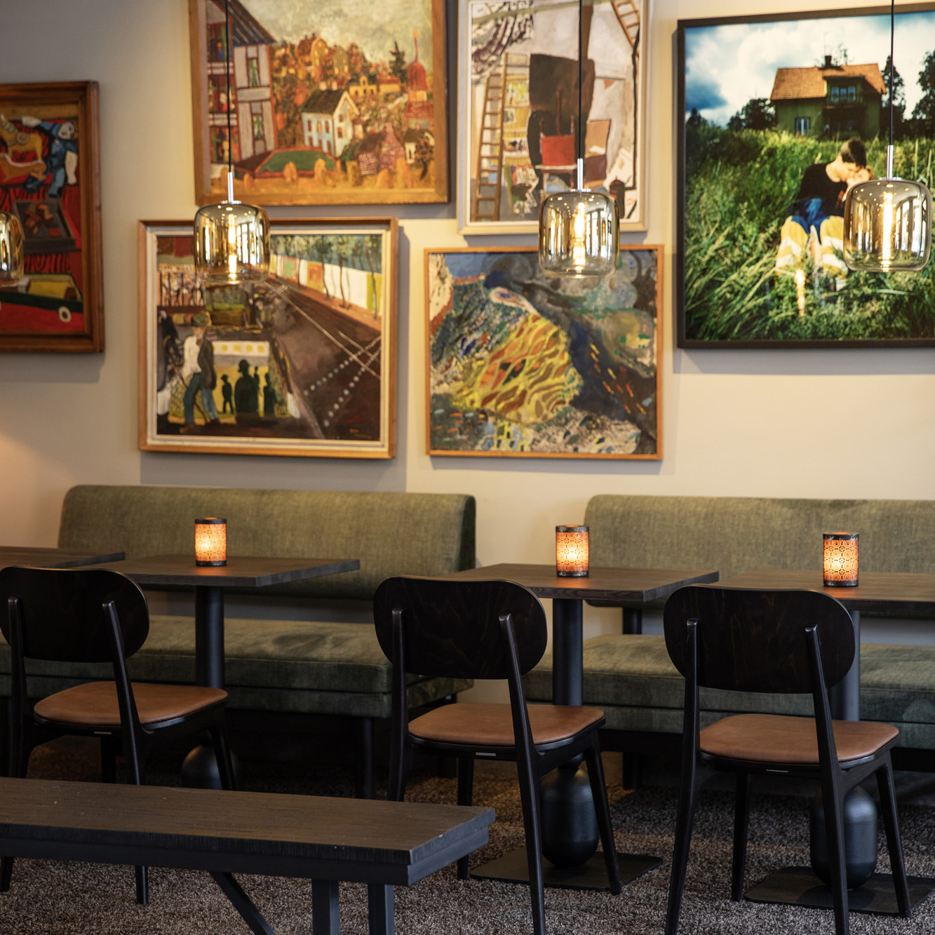 Vi klär om stolsdynor och när rumsavskiljarna i konferensrummet börjar se tråkiga nu – då åker penseln fram! Dessutom tar vi hand om textilierna så att de håller länge, höj gärna blicken i restaurangen och njut av de vackra Pia-lamporna.